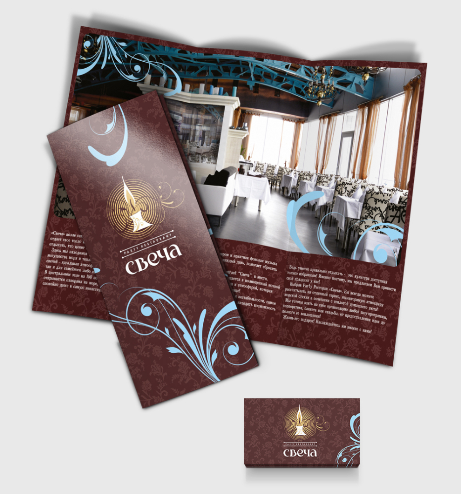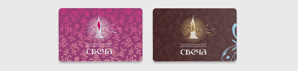 Меню выдержано в стиле ресторана, для фона использованы растительные элементы логотипа. Скидочные карты выполнены в 2 цветах: розовом и коричневом.