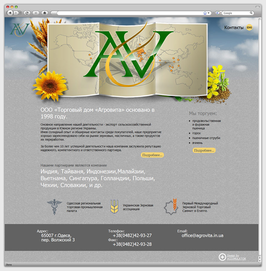 Проект выполнен на сером фоне, который плавно переходит в небо с легкими облаками. Верхнюю половину страницы занимает логотип торгового дома, состоящий из двух заглавных букв на фоне схематической карты мира, где обозначено месторасположение партнеров предприятия. Дополнением служат изображения основных категорий экспорта: пшеницы, гречихи, подсолнечника.