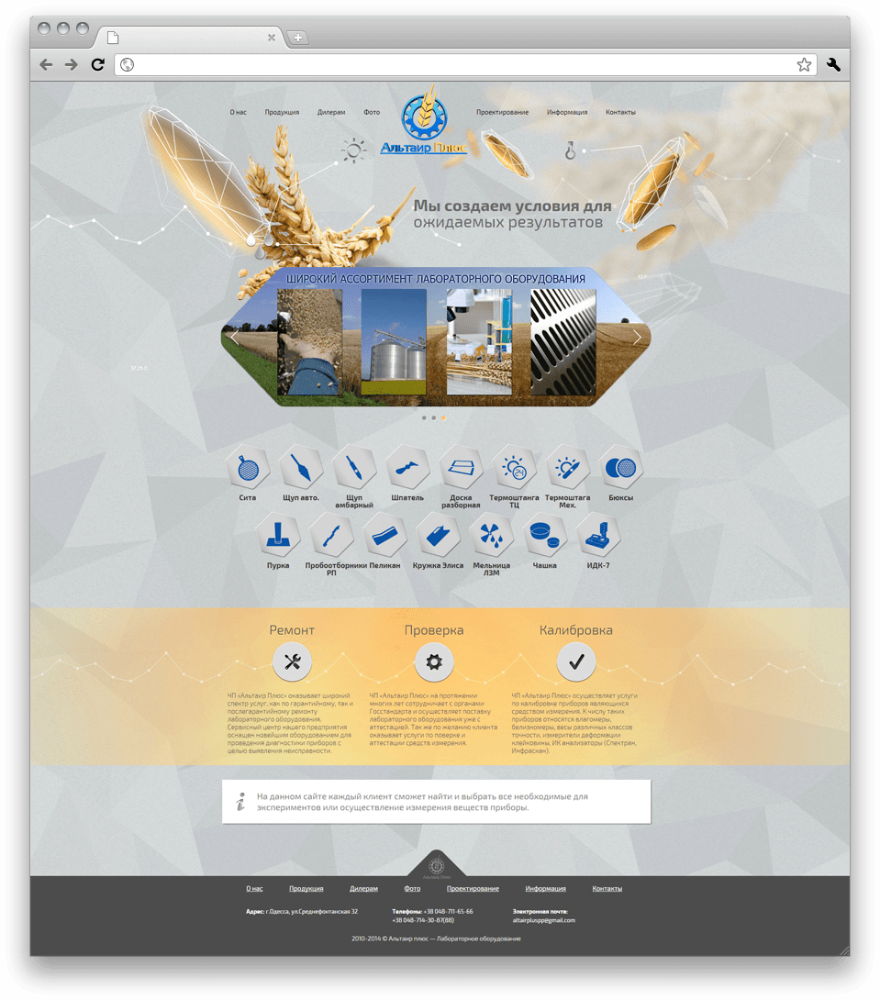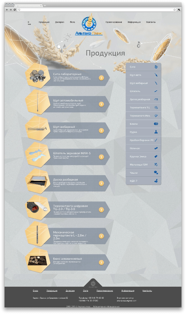 По заданию заказчика нам необходимо было создать веб-представительство торгового дома. Посетитель должен был иметь возможность узнать об истории предприятия, сфере его деятельности, продукции. Кроме того, необходимо было разместить на ресурсе контактные данные и форму для обратной связи.