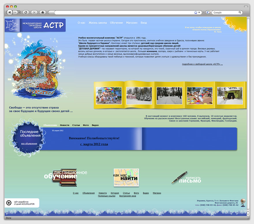 Нашей задачей стало создание информационного сайта для престижной частной школы, который рассказал бы посетителям об образовательном учреждении, его особенностях и достижениях, а также имел бы внутреннюю зону, доступную только для учителей, учеников и родителей. Сайт призван всесторонне осветить работу школы и ее подразделений.