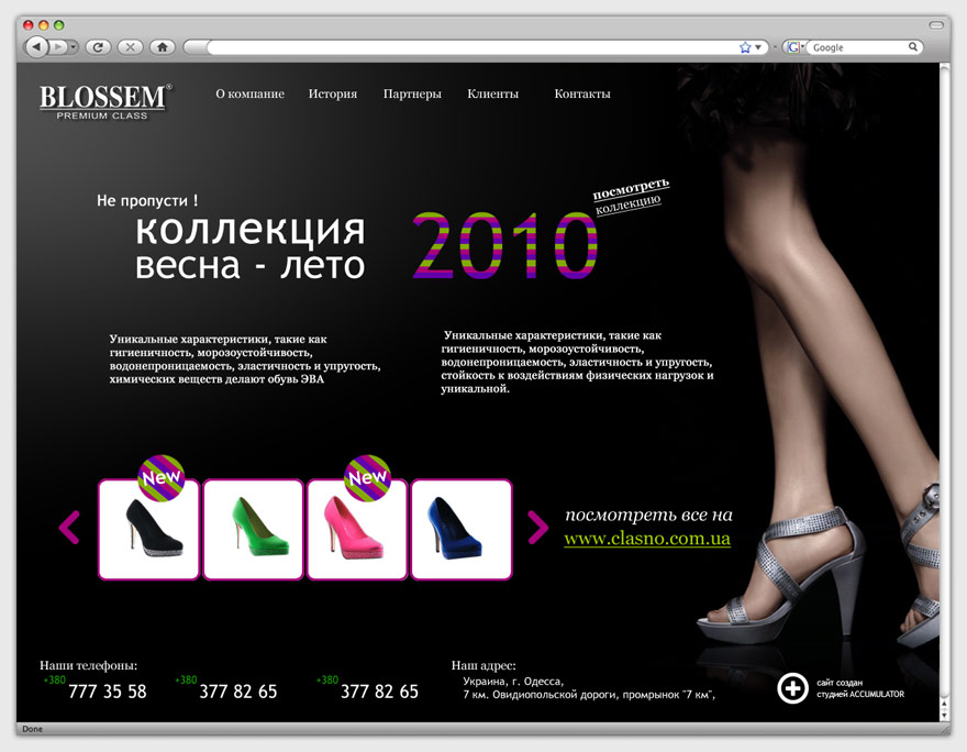 Новинки каталога выделены в отдельную категорию, что облегчает работу с ассортиментом. На главной странице сайта расположен блок быстрого доступа к каталогу с возможностью прокрутки. Контактные данные дублируются в футере каждой страницы, что позволяет сэкономить время посетителей и уменьшить количество переходов по ресурсу.