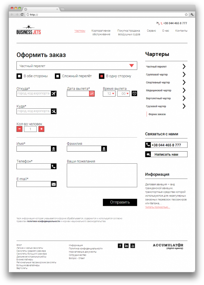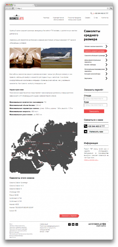 Информационное наполнение сайта разбито на логические части. Форма заказа чартера доступна на главной странице и на каждой странице ресурса. В футере дублируется информация о флоте и подробное описание самолетов каждого класса. Каждая страница описания класса самолетов наглядно иллюстрирована фото и картой направлений маршрутов. В каждом типе чартеров и классе самолетов внизу страницы встроена кнопка, которая ведет на модуль уже с выбранным типом чартера, что упрощает оформление заказа.
