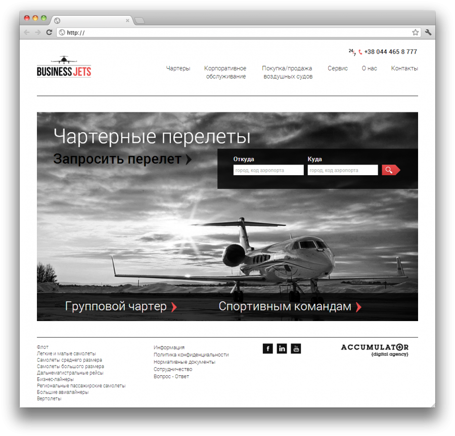 Для заказчика необходимо было создать стильный сайт, который бы ознакомил посетителей с деятельностью компании, особенностями предоставляемых услуг. Ресурс должен был отражать концепцию компании и высокий уровень обслуживания. Так же сайт должен быть функциональным: клиент должен иметь возможность заказать самолет и забронировать билеты, находясь прямо на сайте.