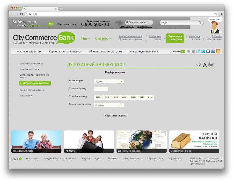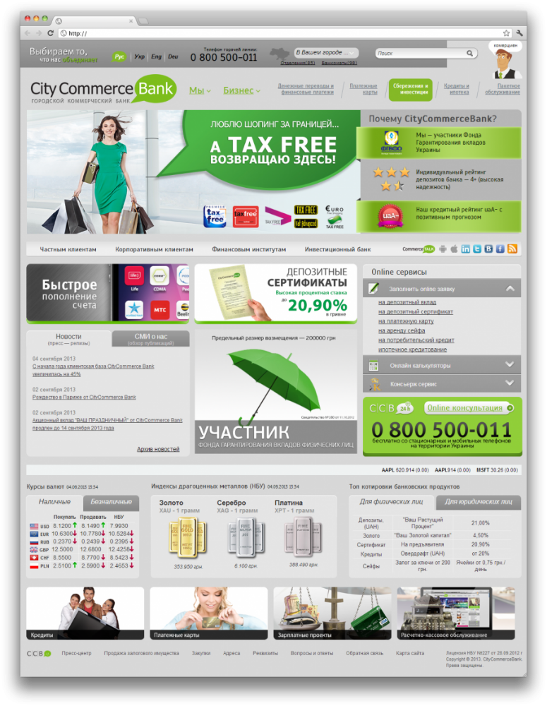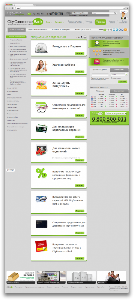 Итог работы: лаконичный, но при этом яркий и стильный дизайн. Основные цвета сайта - серый и зеленый. Новая подача информации при помощи реструктуризации меню и имиджевых баннеров. Так же сайт позволяет совершить интеграцию с внутренними системами банка. Администраторы могут с легкостью импортировать курсы валют, ставок и т.д.