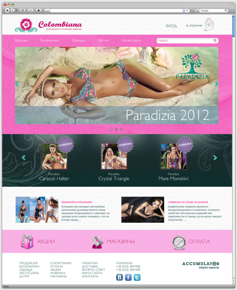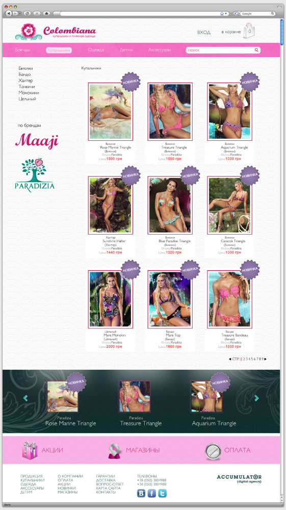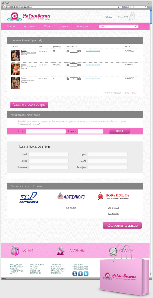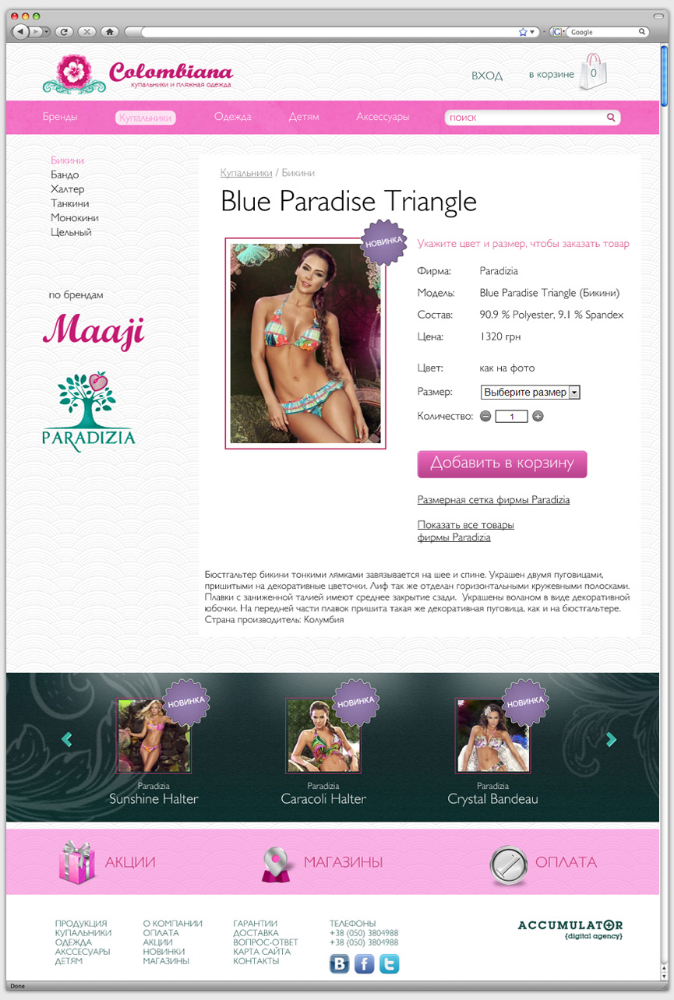 Цветовая гамма для оформления сайта была подобрана в соответствии со спецификой и фирменным стилем интернет-магазина. Жемчужно-белый цвет в качестве фона ассоциируется с морским побережьем. Бирюзовый и розовый цвета присутствуют в логотипе магазина и представленных в нем брендов. Продукция разделена на тематические блоки. Каждый товар имеет иллюстрацию и подробное описание. Сайт оснащен удобной поисковой системой и формой обратной связи.