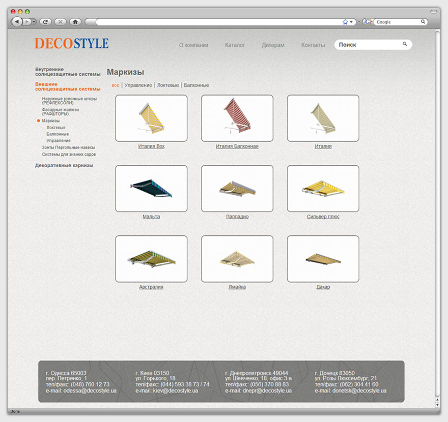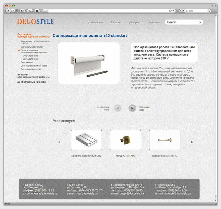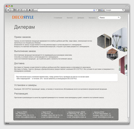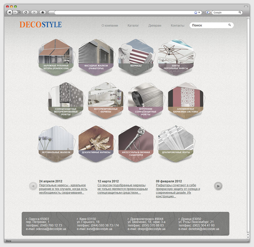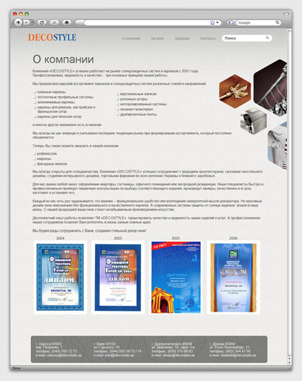 Компания «Decostyle» занимает лидирующие позиции на рынке солнцезащитных систем и карнизов. Многолетний опыт безупречной работы подтвержден многочисленными сертификатами и дипломами. Ассортимент продукции постоянно обновляется в соответствии с тенденциями современного рынка. Компания успешно сотрудничает с ведущими архитекторами и студиями Украины и ближнего зарубежья.