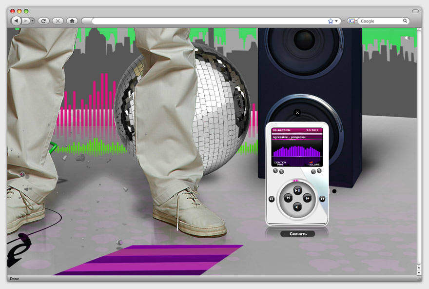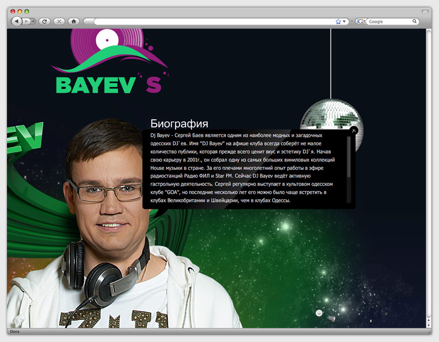 Мы создали музыкальную галактику, в которой все подчинено главному герою. В качестве спутников и планет выступают звуковые волны, зеркальные дискотечные шары и виниловые пластинки. Яркие цвета на фоне урбанистического силуэта в отдалении символизируют стиль заказчика: он несет позитив в серые будни человечества, призван спасти людей от рутины. Музыкальное оформление сайта представлено авторскими работами dj Bayev, которые загружены в виртуальный плеер, расположенный на отдельной странице.