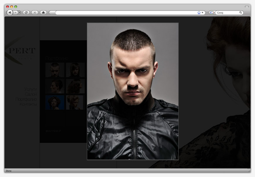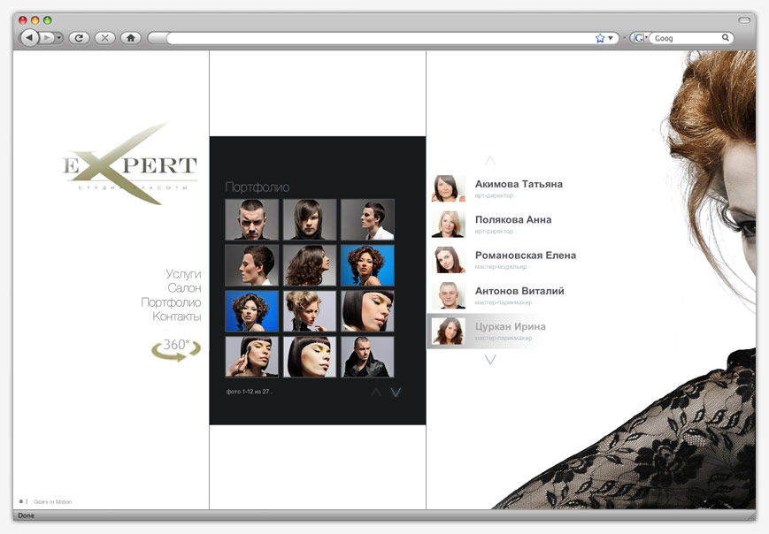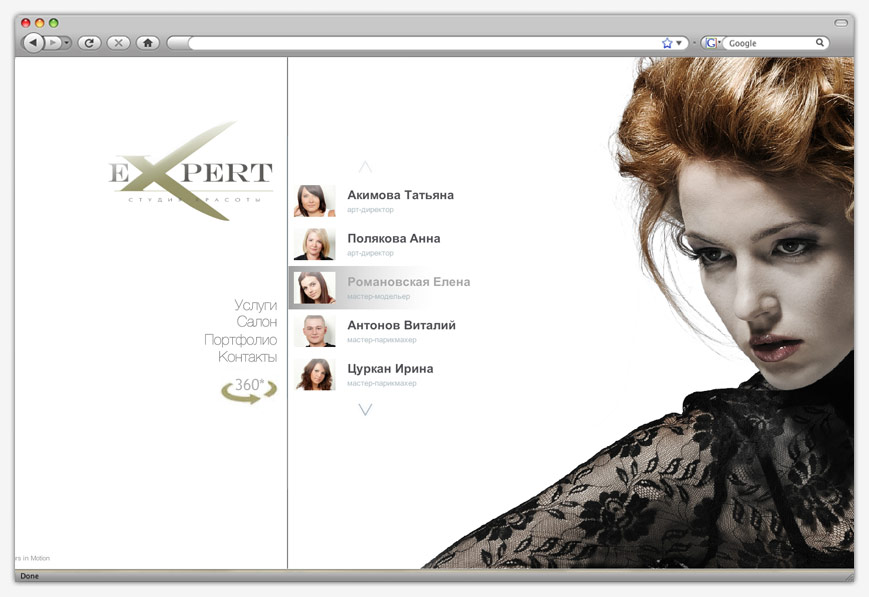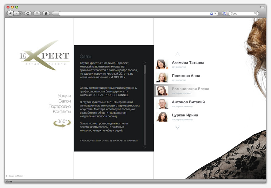 Сайт студии красоты выполнен в строгой черно-белой гамме. Основной акцент сделан на белый цвет как символ чистоты, которая имеет первостепенное значение для заведения сферы услуг. На главной странице посетителя ожидает знакомство с персоналом студии. Используя вертикальное меню можно получить более детальную информацию как о самом заведении, так и о предоставляемых услугах, ознакомиться с образцами выполненных работ.