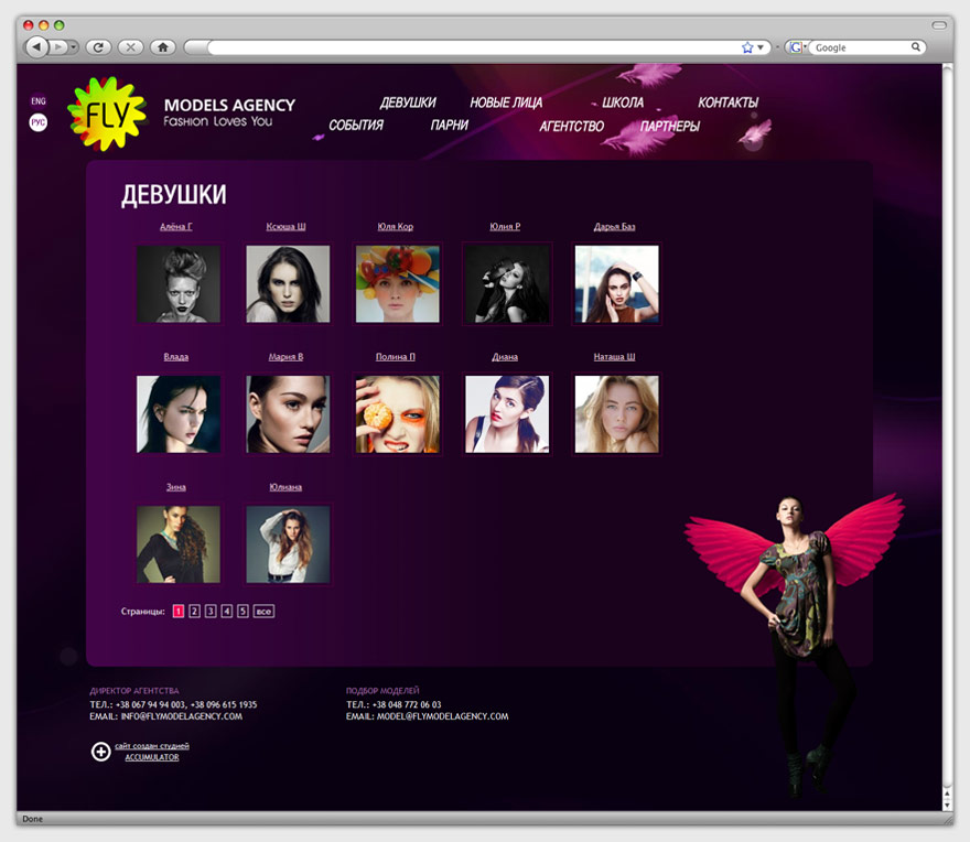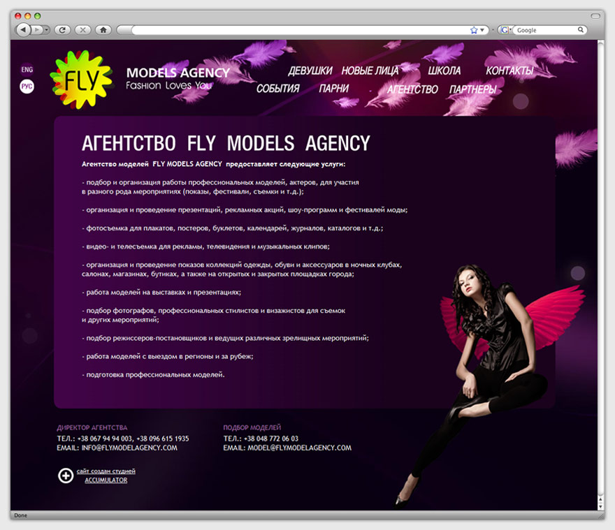 Название агентства обыграно динамичными перышками в качестве подложки для меню сайта. Также этот элемент появляется при выделении какого-либо из пунктов меню и присутствует на фото моделей, которые иллюстрируют страницы ресурса. Сайт выполнен в англоязычной и русскоязычной версиях. База данных разбита на категории, для каждой модели создано флеш портфолио. Обилие графических и анимированных объектов не снижает скорость работы сайта.