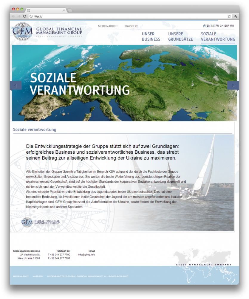 Сайт выполнен в строгом минималистском стиле. Основной цвет — белый, для заголовков использован темно-серый. Представлена информация об истории компании и ее достижениях, сферах деятельности и предоставляемых услугах, партнерах. Для каждого направления используются имиджевые баннера и изображения.