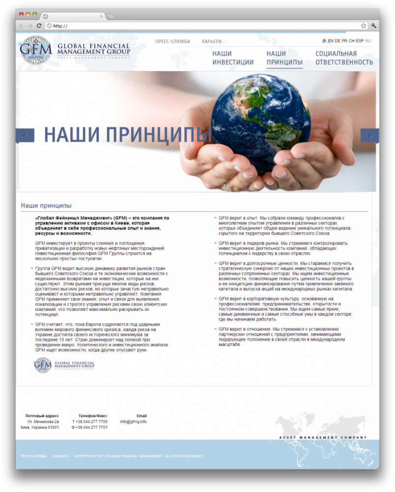 На главной странице проекта посетители сразу могут ознакомиться с основными направлениями деятельности компании. Сайт представлен на 6 языках: русском, английском, немецком, французском, китайском и испанском.