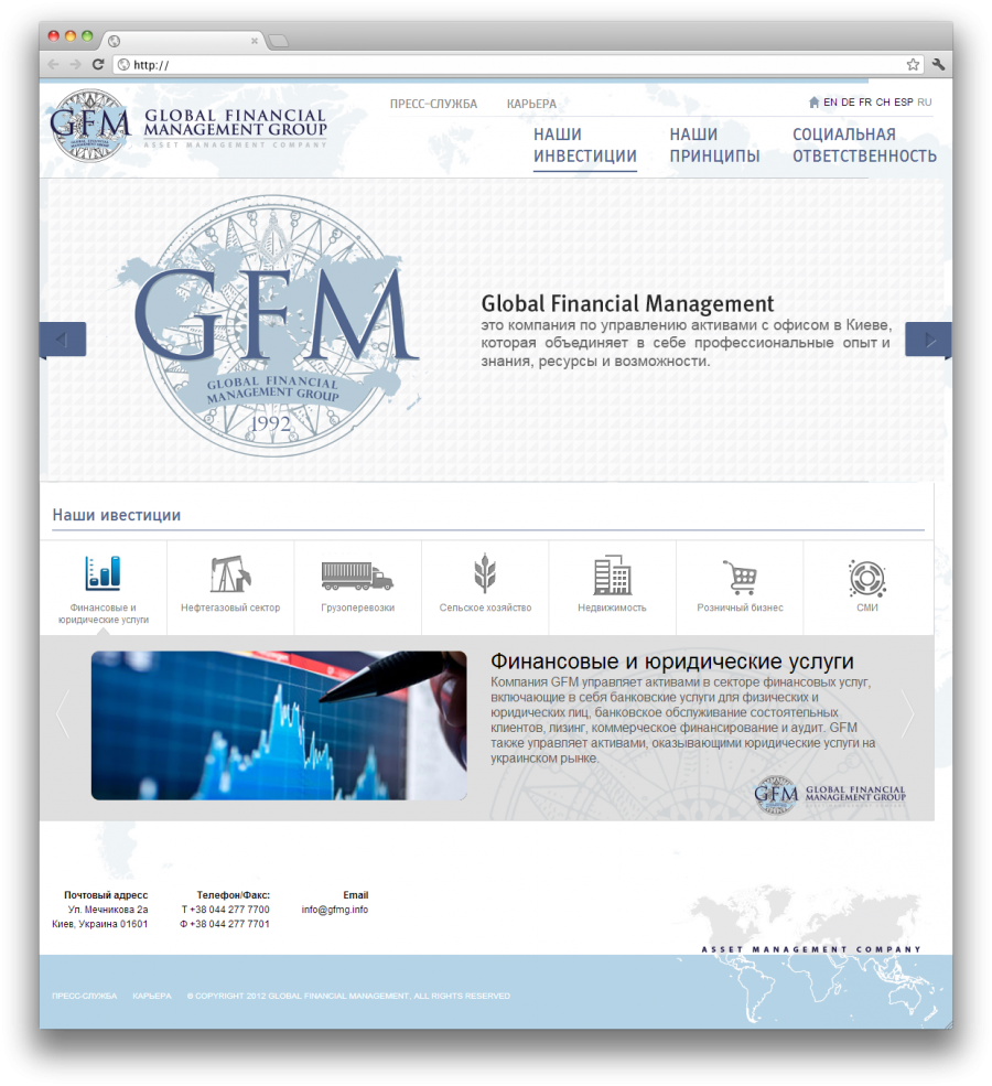 Компания GFM управляет активами в секторе финансовых услуг, включающие в себя банковские услуги для физических и юридических лиц, банковское обслуживание состоятельных клиентов, лизинг, коммерческое финансирование и аудит. GFM также управляет активами, оказывающими юридические услуги на украинском рынке.
