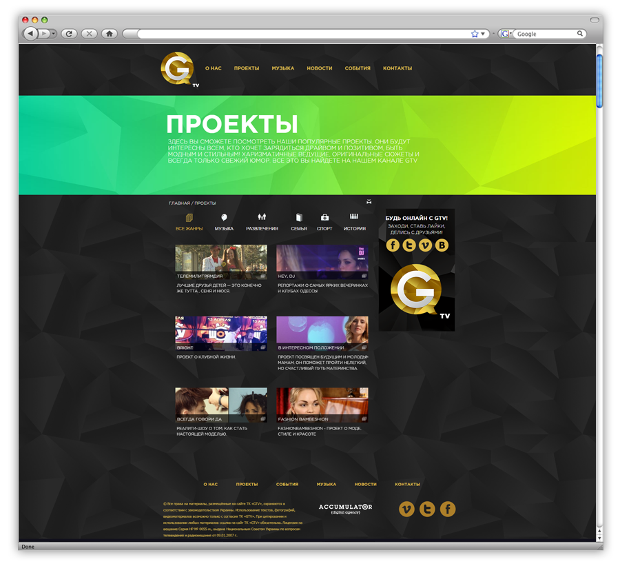 GTV - это сеть увлекательных и познавательных каналов. Зрителями, чаще всего, являются молодые люди проявляющие интерес к творчеству, интересующиеся современной техникой и научными достижениями.