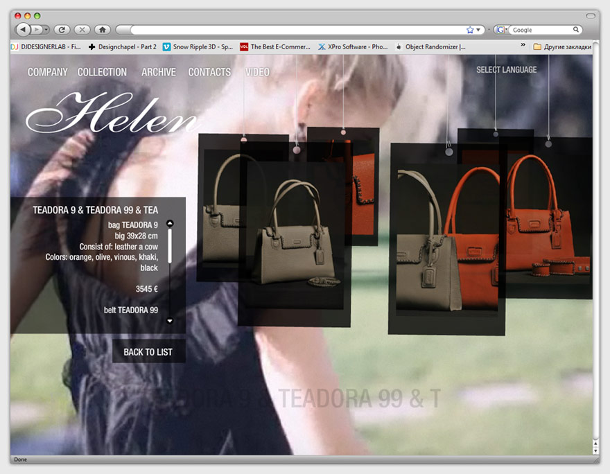 Мультимедийное оформление каталога позволяет клиентам не только ознакомиться с основными характеристиками продукта, но и подробно рассмотреть его оформление и качество изготовления. Также у посетителей сайта есть возможность просмотреть изделия из предыдущих коллекций компании. В разделе контакты расположена форма обратной связи.