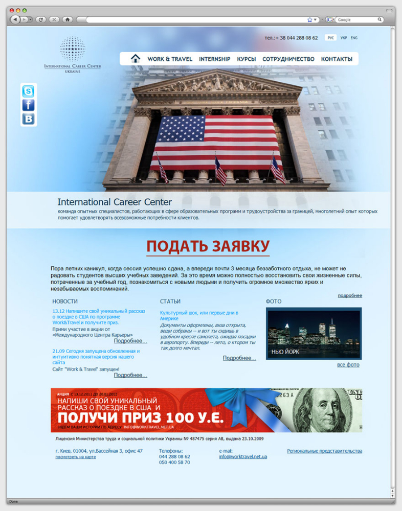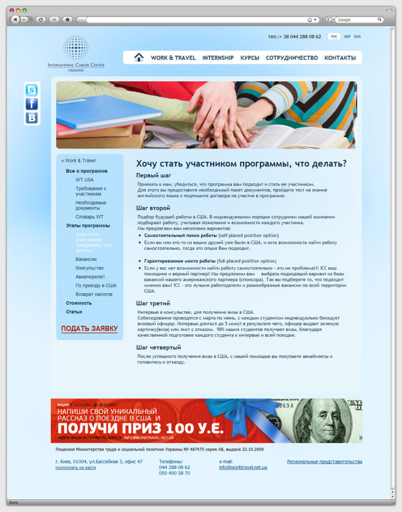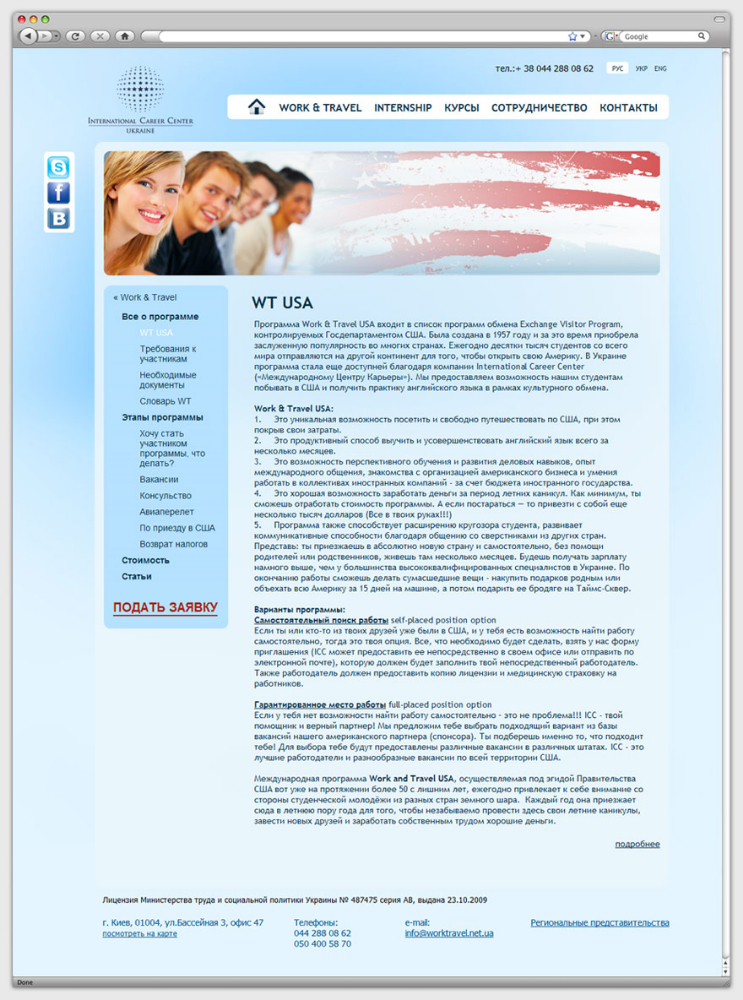 В основе сайта лежит голубой фон, который приятен глазу. Рабочее пространство ресурса разбито на удобные блоки. В оформлении сайта широко использованы графические материалы, соответствующие направленности заказчика. С помощью ресурса посетители могут получить исчерпывающую информацию о программе Work & Travel, подать заявку на участие, прочесть полезную информацию.