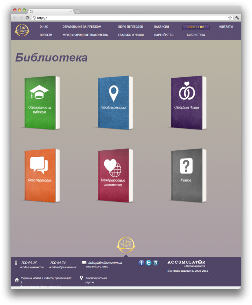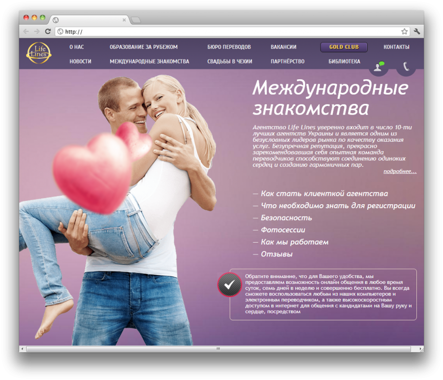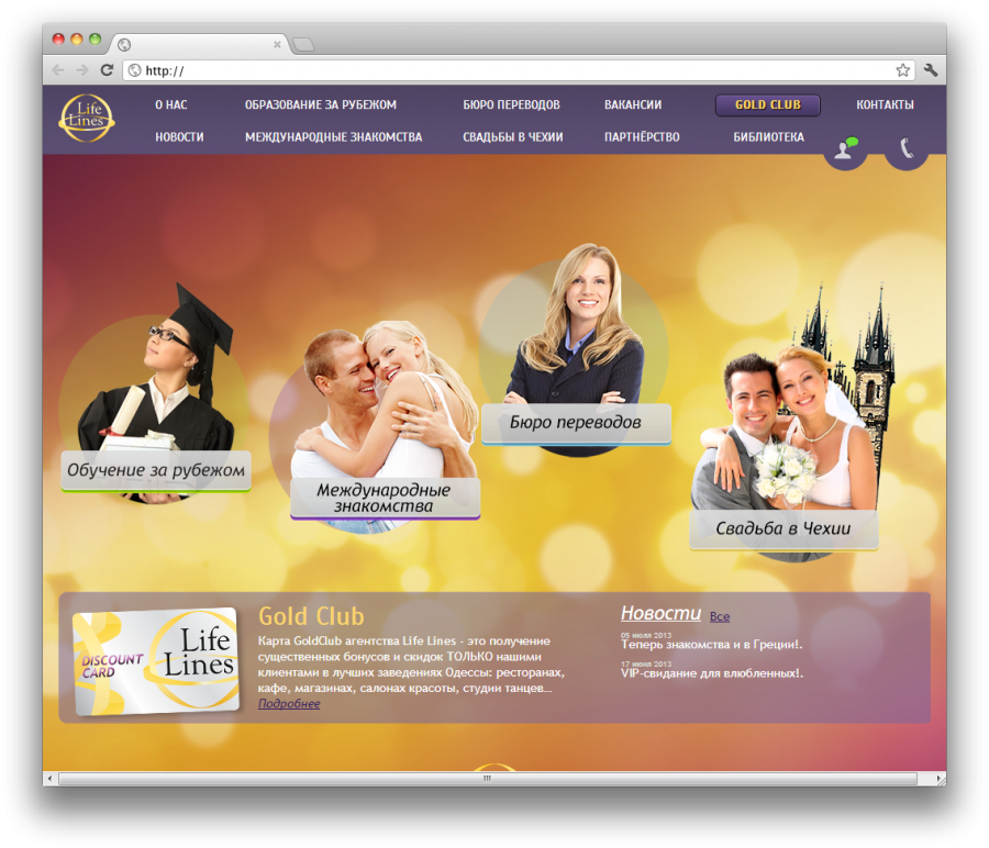 Компания Life Lines была основана в 2004-м году и уже почти 10 лет успешно работает на украинском и международном рынках. Основными направлениями деятельности компании являются: обучение за рубежом, организация свадеб в Чехии, международные знакомства, бюро переводов, апостиль, справка о несудимости и др. услуги.