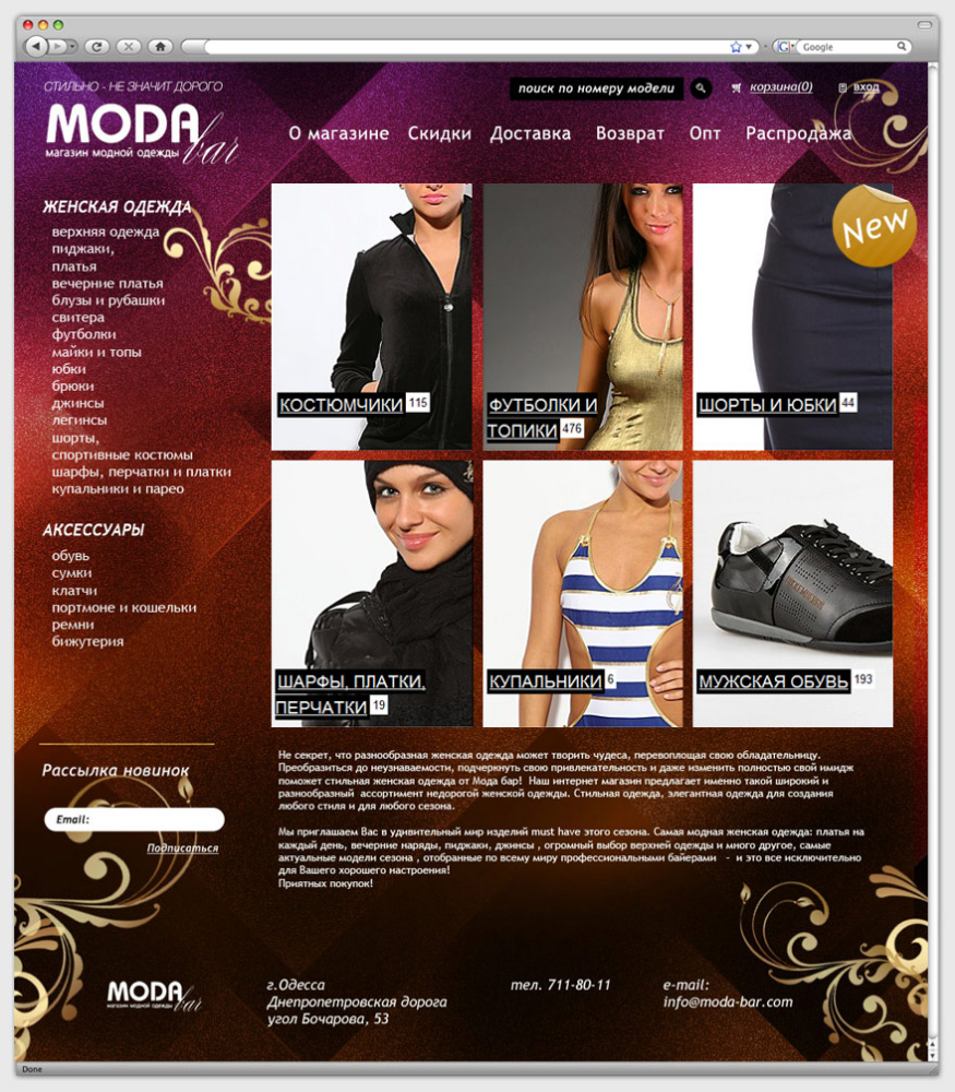 Необходимо было создать сайт интернет-магазина с интуитивно понятным интерфейсом и удобной навигацией. Стиль ресурса должен был соответствовать слогану заказчика: «Стильно — не значит дорого», то есть быть запоминающимся и ярким, но при этом функциональным и доступным любому пользователю. Информационное наполнение сайта было призвано ознакомить посетителей с ассортиментом товаров и дать возможность сделать заказ, не отходя от монитора.