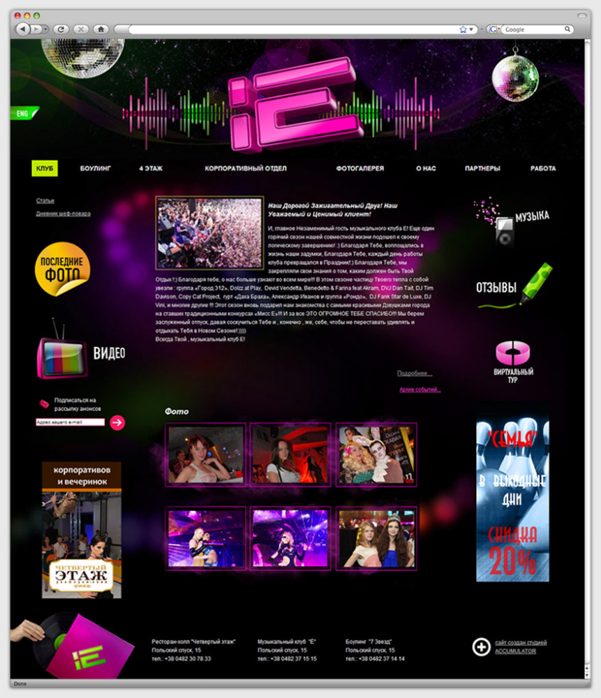 Сайт клуба должен соответствовать направленности заведения и отображать его философию. Так как «Ё» является многофункциональным развлекательным комплексом, то на сайте должно быть предусмотрено отображение каждой составляющей конгломерата. Ресурс должен соответствовать последним тенденциям дизайна, быть функциональным, выдерживать большие нагрузки, обусловленные наличием мультимедиа и высокой посещаемостью.