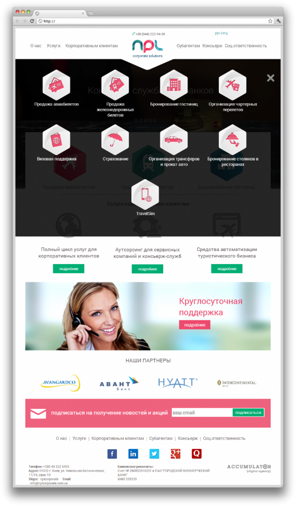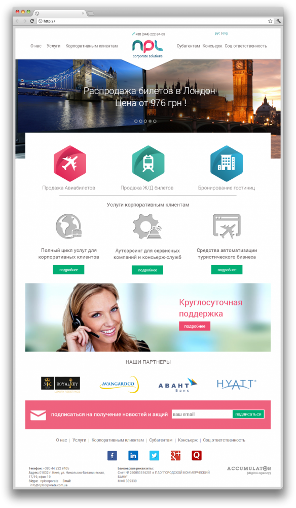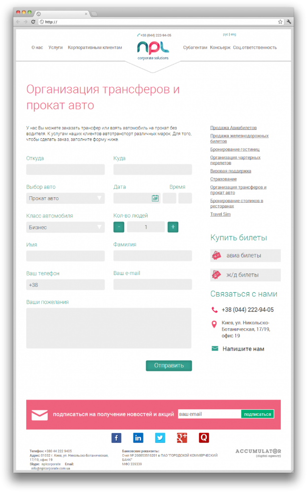 Для заказчика необходимо было создать информационный сайт, который бы ознакомил посетителей с деятельностью компании, особенностями предоставляемых услуг. Так же веб-ресурс должен быть функциональным: возможность покупки авиа, ж/д билетов, заказа автомобиля или трансфера, бронирования гостиницы.