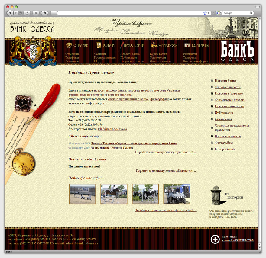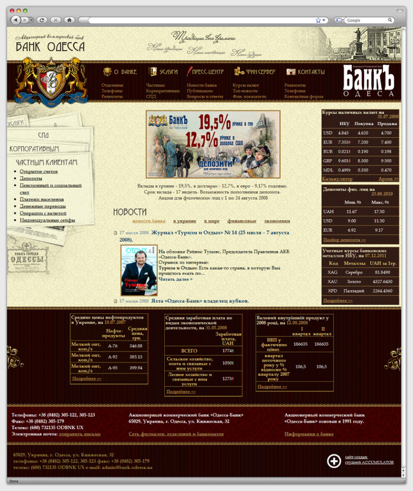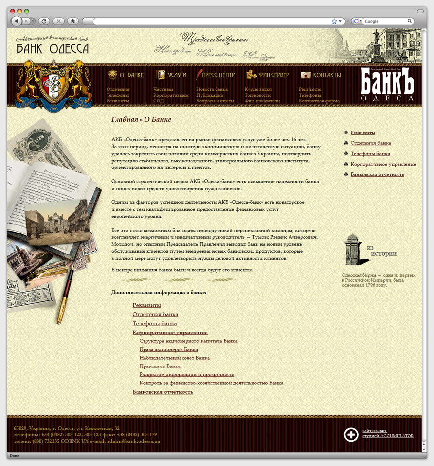 Целью нашей работы стало создание корпоративного сайта банка, который бы отображал девиз заказчика: «Традиции вне времени». Основная направленность ресурса — информирование посетителей о деятельности банка. Кроме того, сайт должен выступать в роли банковского советника, предоставляя широкие возможности для пользователей.