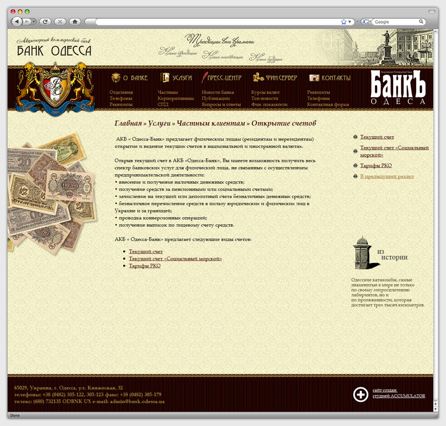 Помимо своей основной функции, сайт также можно назвать познавательным ресурсом: здесь можно найти информацию по истории финансов, получить ответы на возникшие вопросы и даже ознакомиться с банковским юмором. Фотоальбом покажет банковские будни и праздники без ретуши. А финансовый сервер предоставит информацию о курсах валют и последних новостях в режиме реального времени.