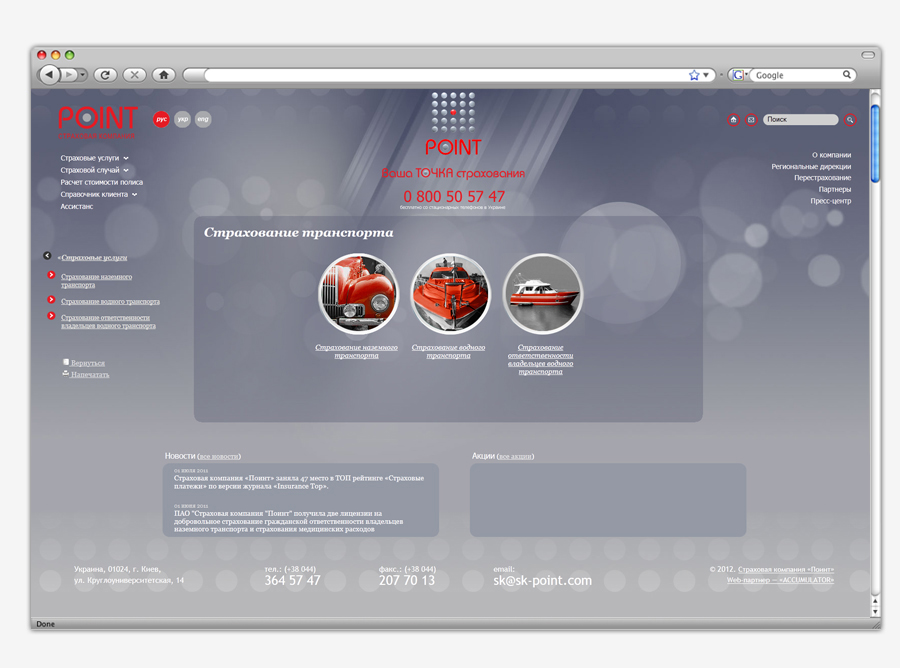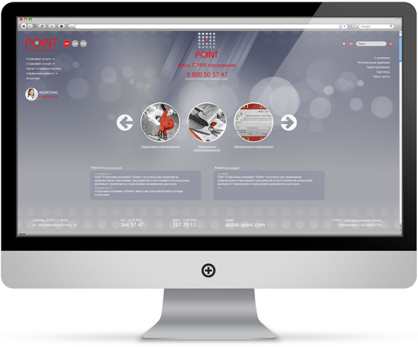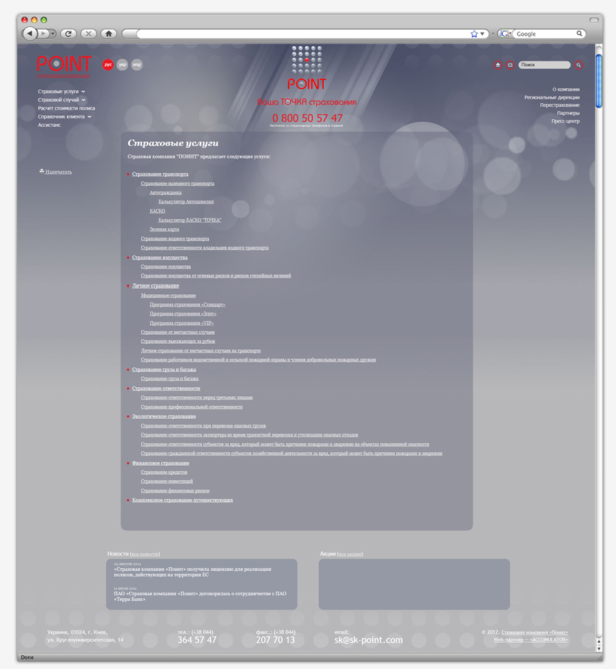 Страховая компания «Поинт» является публичным акционерным обществом с опытом работы более 7 лет, предоставляющая широкий спектр страховых услуг частным лицам и компаниям для защиты от самых разнообразных рисков. На сайте компании реализован полезный функционал, позволяющий посетителям сайта узнать полезную информацию о страховании, получить тематическую консультацию и просчитать возможные варианты стоимости страховых случаев и полисов, узнать о региональных дирекциях компании и просмотреть ее отчестность.