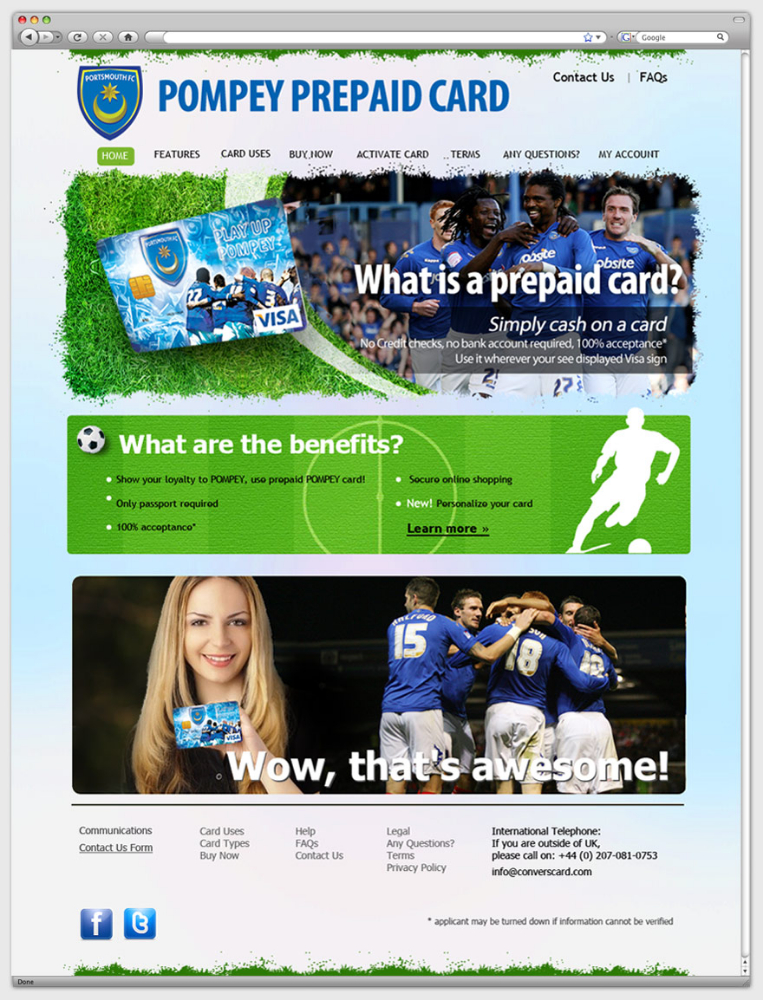 В оформлении сайта широко использованы графические объекты футбольной тематики. С помощью ресурса посетители могут узнать подробности о фирменной расчетной карте, условиях и сроках ее использования, получить ответы на возникшие вопросы благодаря форме обратной связи, а также проверить состояние собственного счета. Футер сайта содержит контактную информацию и дублирует разделы основного меню.