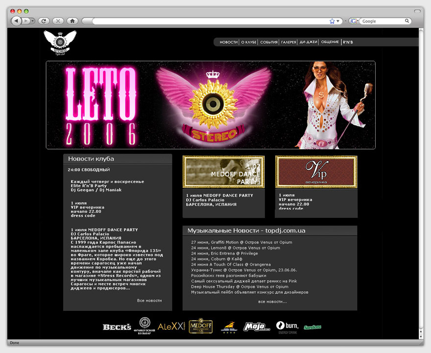 Информационное наполнение сайта достаточно разнообразно. Кроме информации, касающейся непосредственно клуба и проходящих в нем мероприятий, посетитель может узнать о последних новостях из мира клубной музыки, послушать лайв-сеты артистов, выступавших на сцене клуба и пообщаться с единомышленниками. Футер сайта заполнен логотипами производителей алкогольных и безалкогольных напитков.