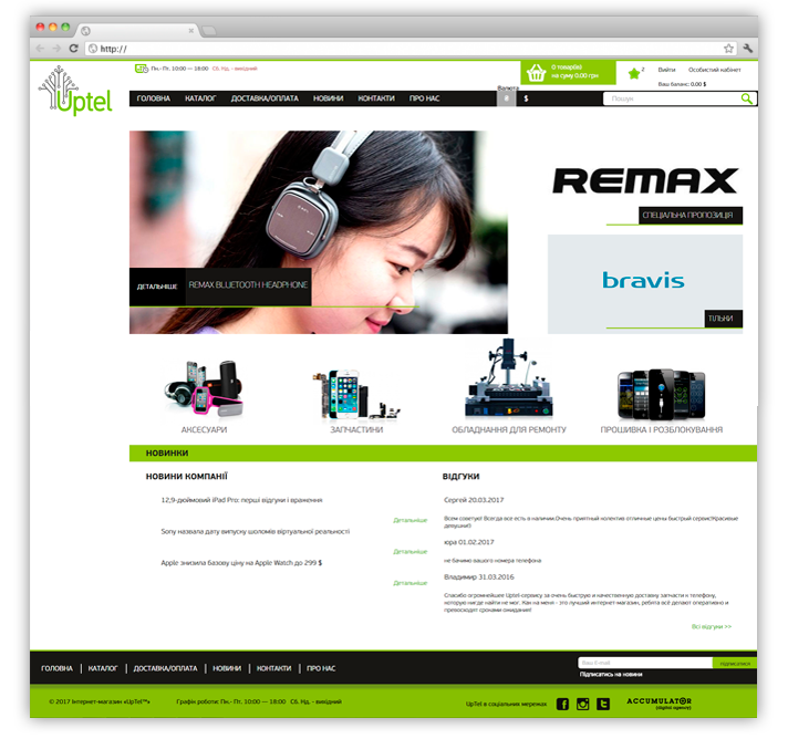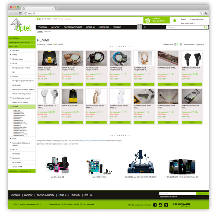 Интернет-магазин «Uptel» занимается продажей аксессуаров, запчастей и оборудования для ремонта мобильных телефонов, планшетов, ноутбуков, фотоаппаратов и т.д. Магазин работает во всех направлениях, как с оптовыми покупателями, так и с розничными. Интернет -магазин «Uptel» предлагает широкий ассортимент товаров на любой вкус по доступной цене.