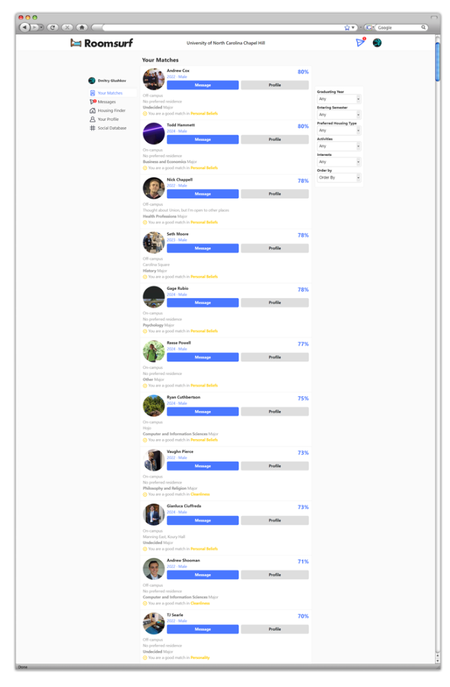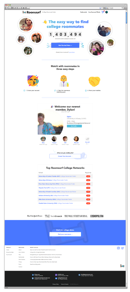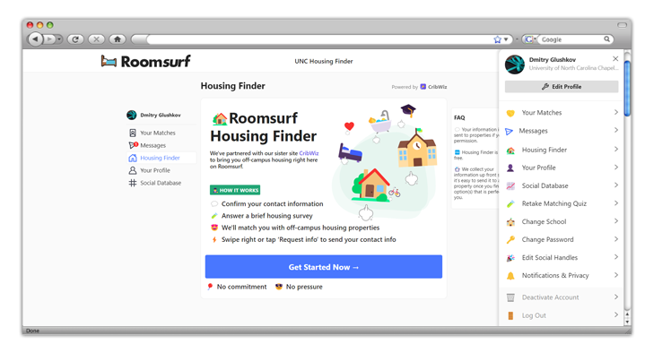 Roomsurf — это ресурс социальной сети, который помогает старшеклассникам и учащимся колледжей находить совместимых соседей по комнате и общаться с ними.
